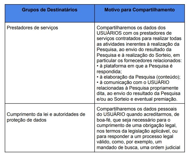 para as finalidades listadas no item 4 desta Política.
